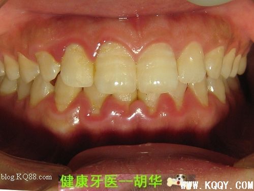 术前照(下前牙龈呈暗红色,松软脆弱,龈缘变厚与牙面分离,龈乳头圆钝肥大)