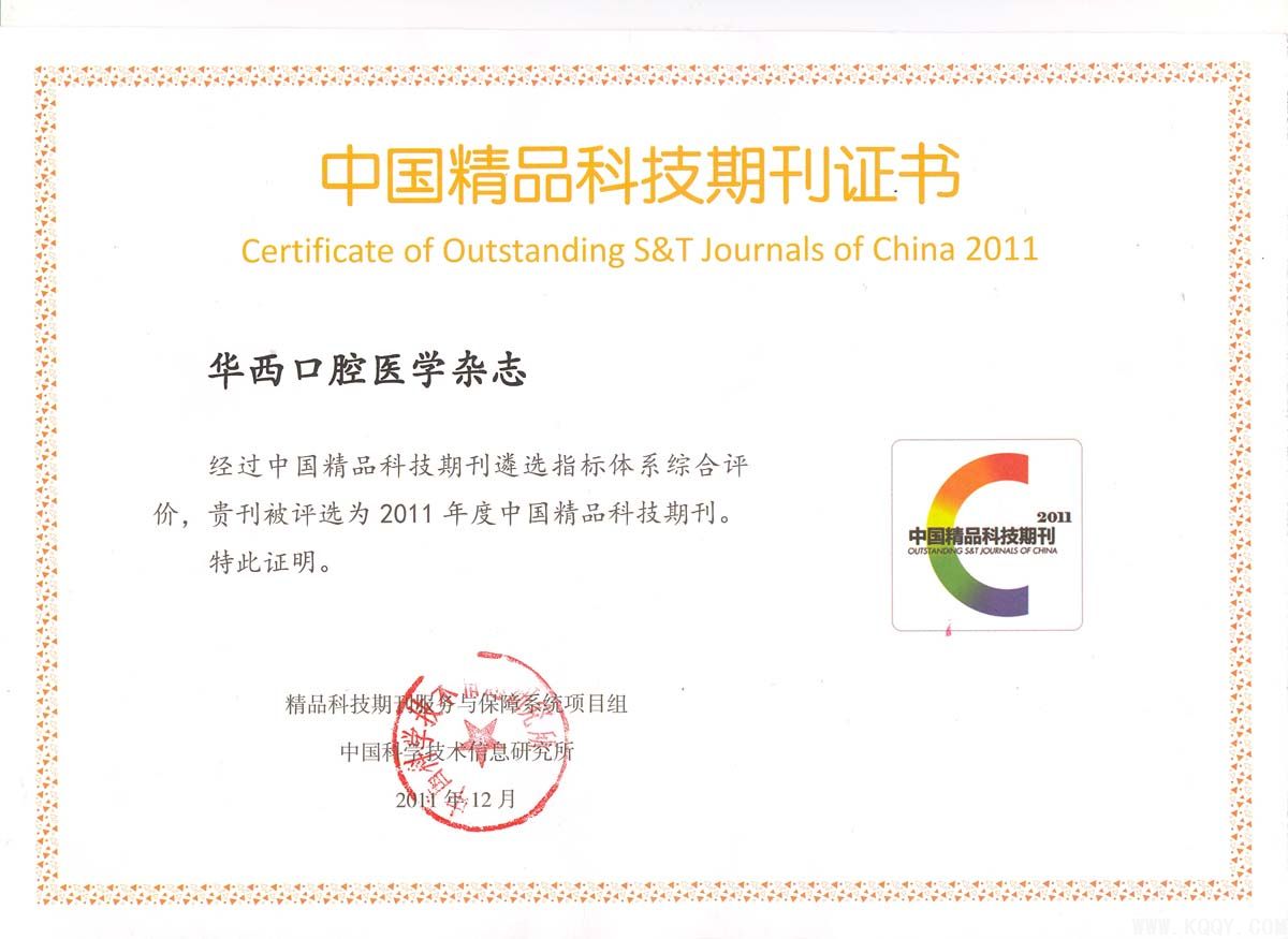 核心提示:《华西口腔医学杂志》再次被评选为中国精品科技期刊